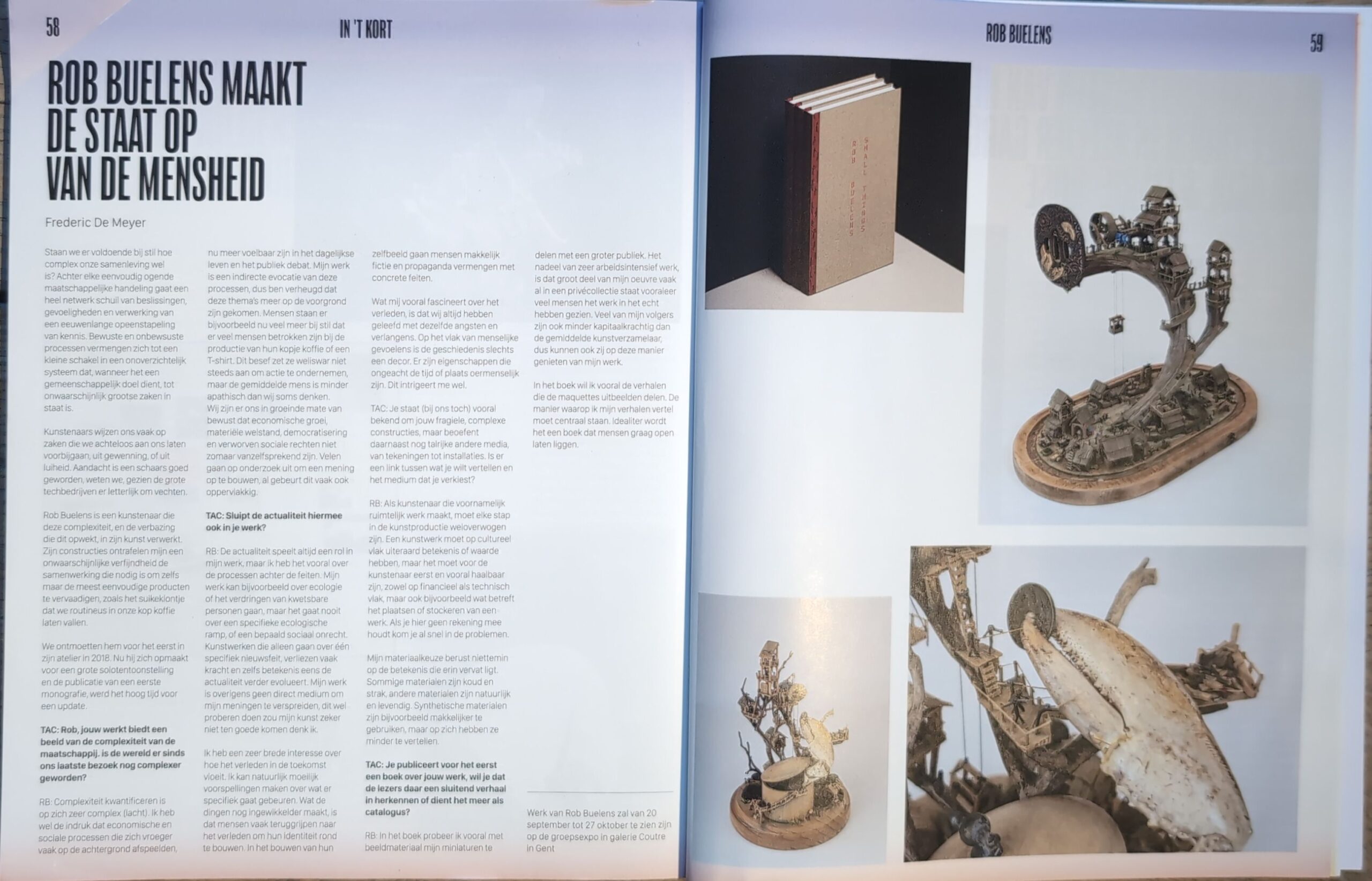 Elke afzonderlijke maquette ontvouwt een wereld op zich, waardoor we haast zouden vergeten dat de transparante glasplaten visuele communicatie toelaten met zowel andere maquettes als met de volledige omgeving. Vanuit hun nabuurschap breidt de visuele verschijning van de kunstwerken zich uit. Het samenspel van meerdere taferelen verbreedt de betekenisgeving, doordat nog meer miniwerelden in elkaar schuiven. Die dialoog speelt zich eveneens af tussen de maquettes en de aanwezige artefacten in het museum – artistiek, archeologisch, om het even wat. De modellen gedragen zich niet ostentatief en treden evenmin op als stoorzenders. Wel beïnvloedt hun aanwezigheid onvermijdelijk onze blik op het verhaal van de andere museumobjecten. Met hun relativerende humor plaatsen ze iedereen terug met beide voeten op de grond. Ze illustreren ook dat zoveel intelligent en emotioneel leven zich afspeelt buiten onze gezichtseinder onder andere horizonten, in andere tijden en culturen, doorheen ontelbare onderwerpen. Vooral leren we dat menselijke ondernemingen steunen of vallen bij monde van een schare medewerkers. Een doordenkertje in de cultuur van het narcisme.