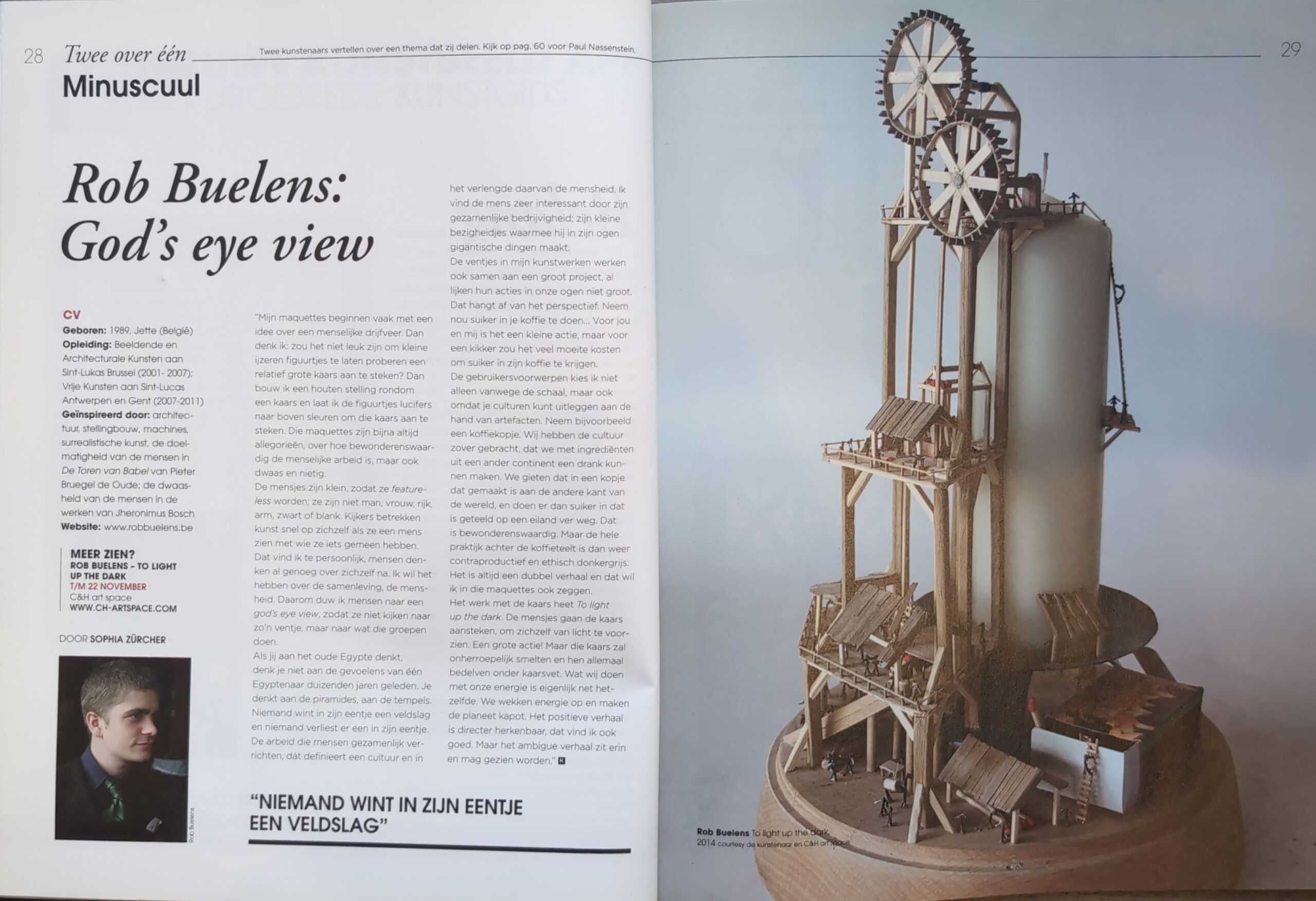 De maquettes van Rob Buelens intrigeren ons van op afstand, maar we krijgen pas inzicht in de taferelen door er rondom te lopen en de details te analyseren vanuit verschillende gezichtspunten. Elke constructie ontvouwt een drukte van jewelste, het wemelt er van anonieme figuurtjes en opgestapelde materialen. Het lijkt komisch omdat een massa lilliputters zich met vereende krachten uitslooft voor een monumentaal project dat boven hun petje reikt. Hoewel er weinig twijfel over bestaat dat ze hun einddoel zullen bereiken, gezien de vindingrijkheid van hun werktuigen en arbeidsorganisatie. Onder de menigte vallen er geen grotere of mindere talenten te onderscheiden, maar we weten dat de ingenieurs en de noeste arbeiders er allemaal ergens tussen zitten. Iedereen draagt naar eigen kunde zijn steentje bij en er wordt verder niet over gezeurd, want de voltooiing zal voor iedereen een wereld van verschil uitmaken.