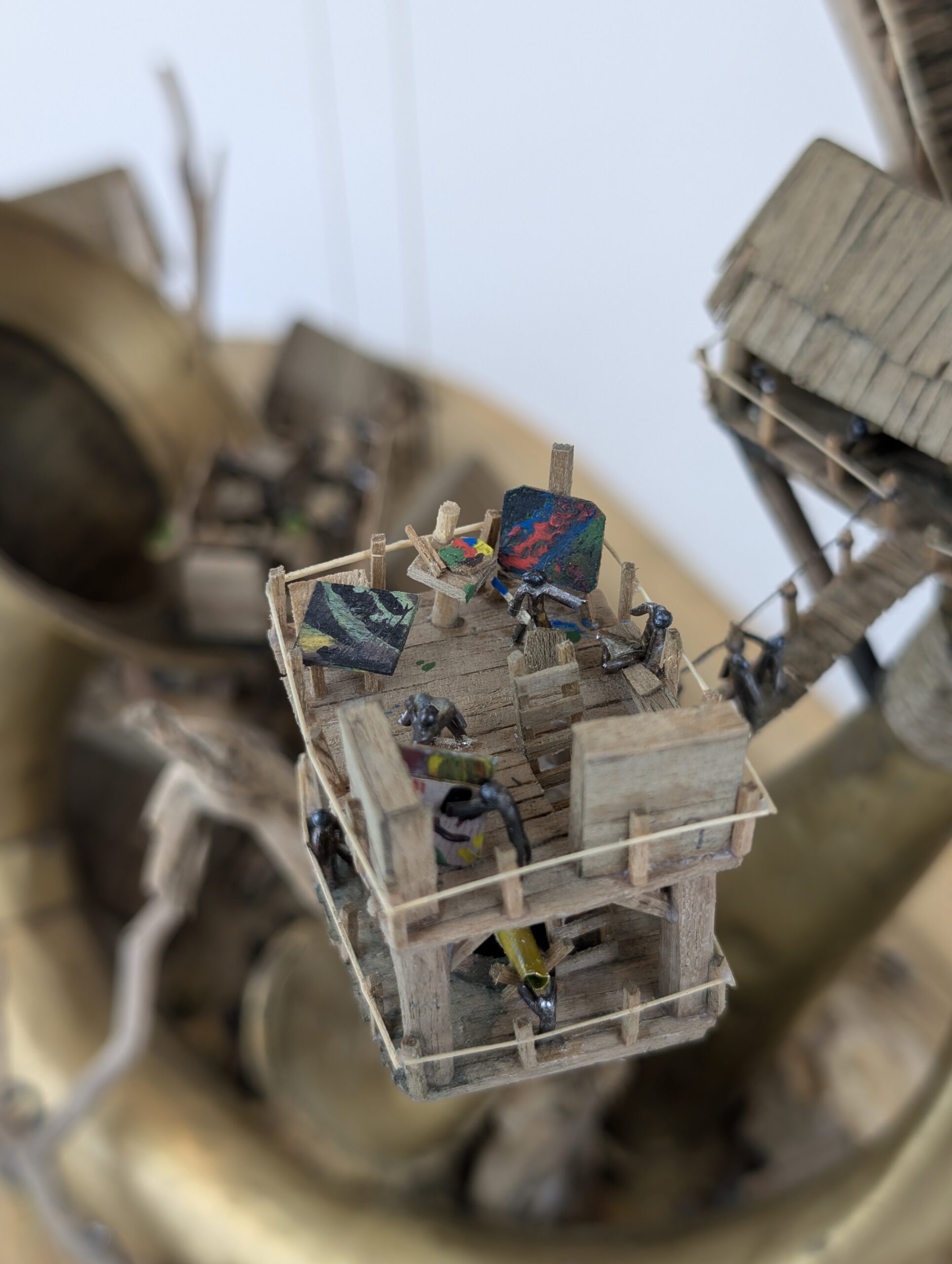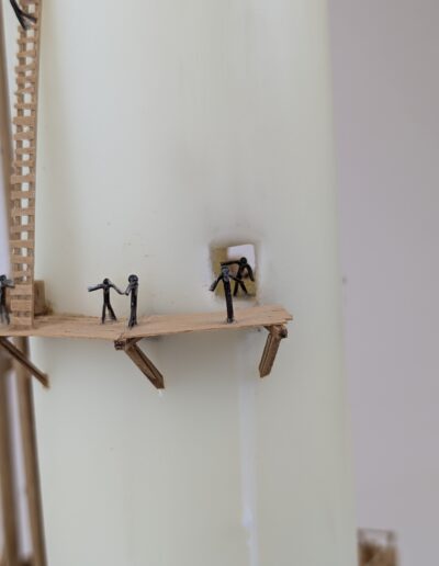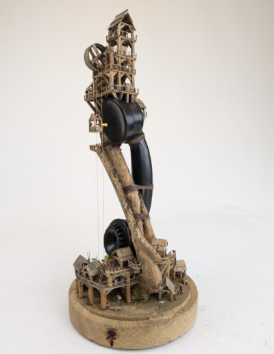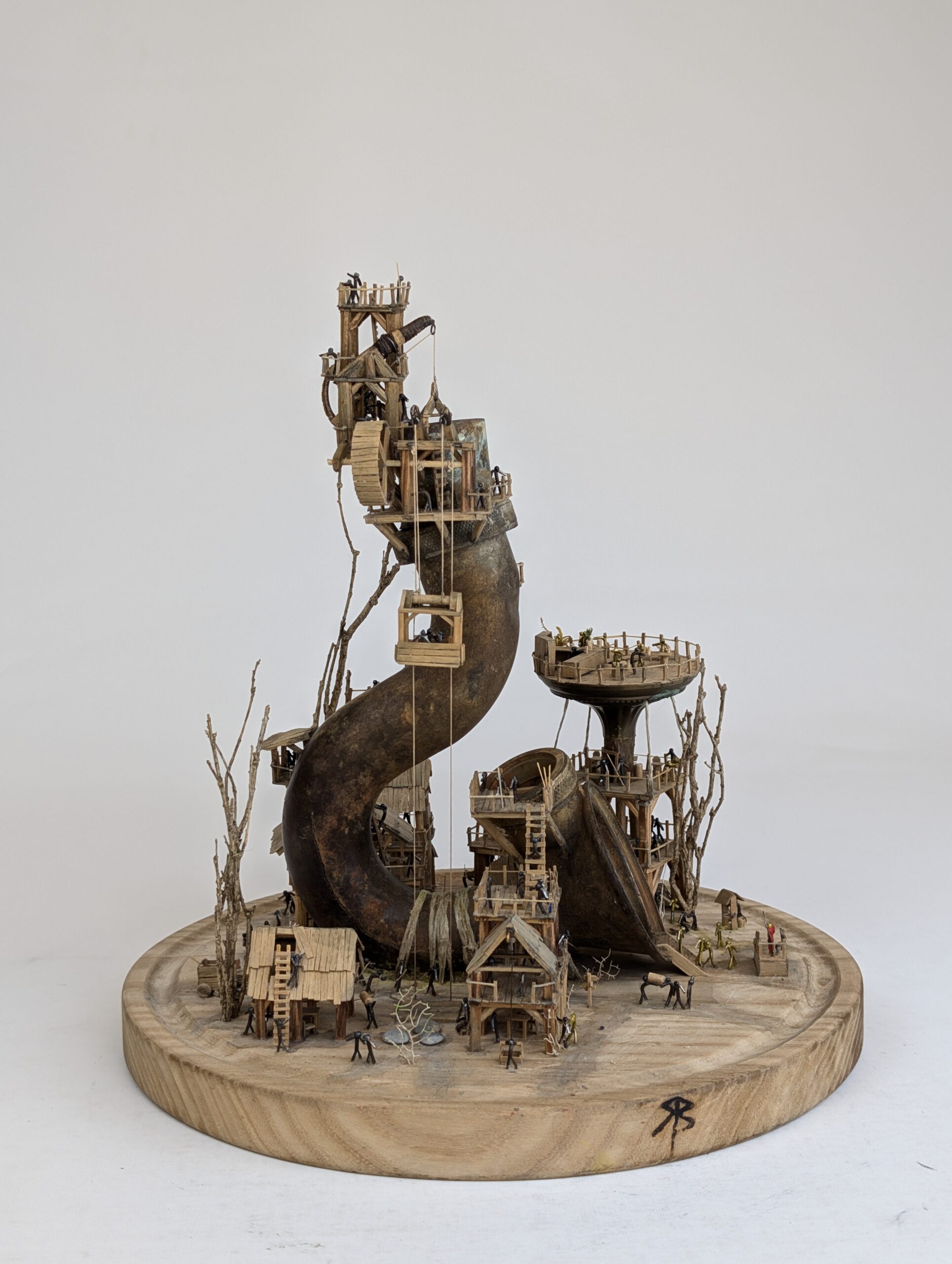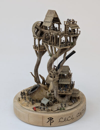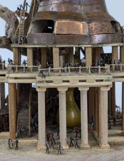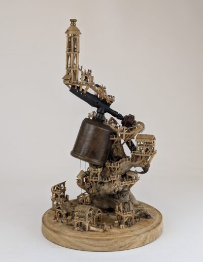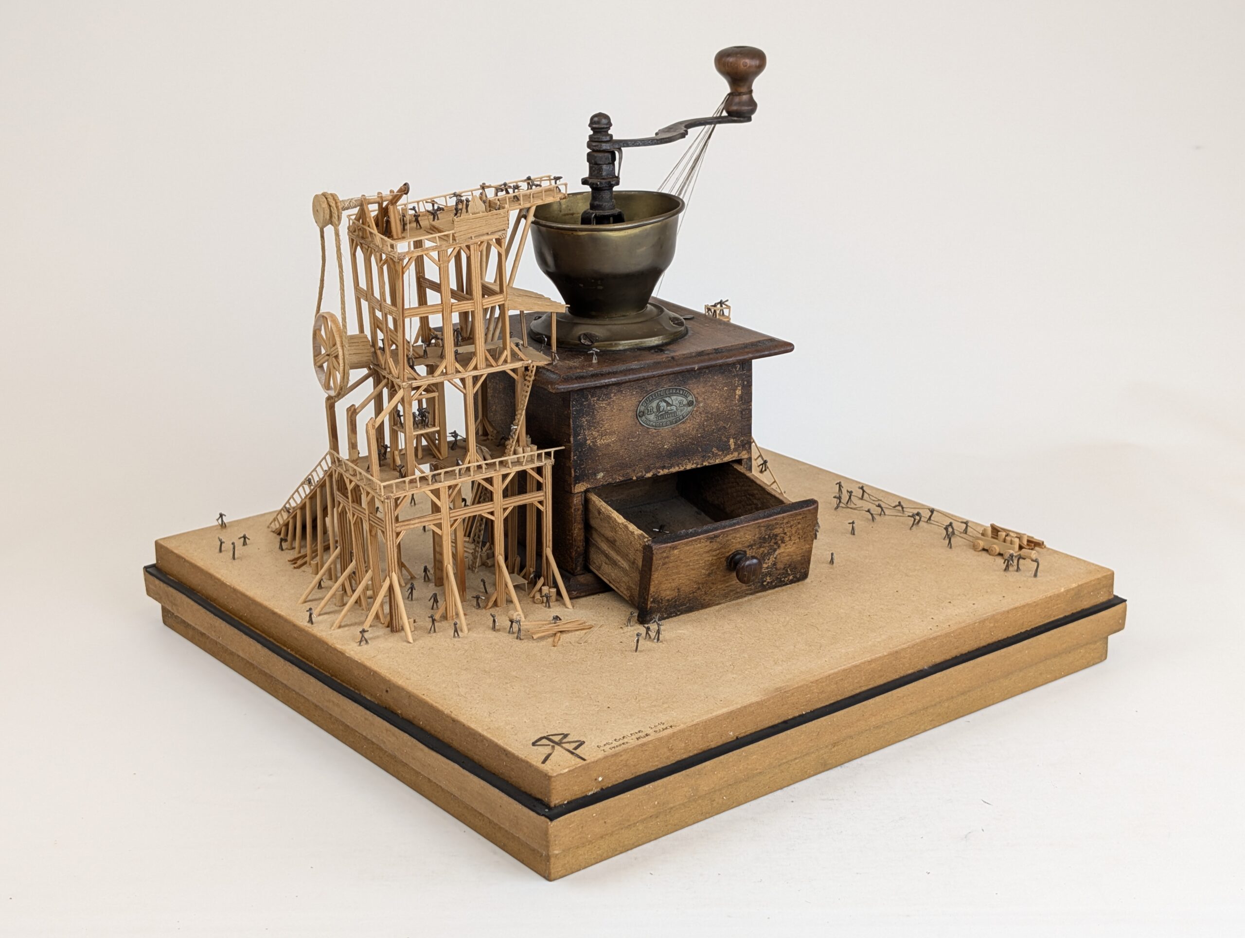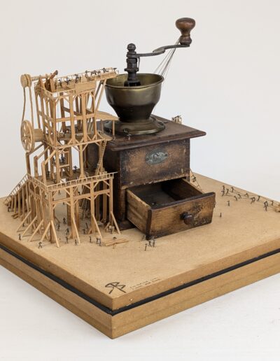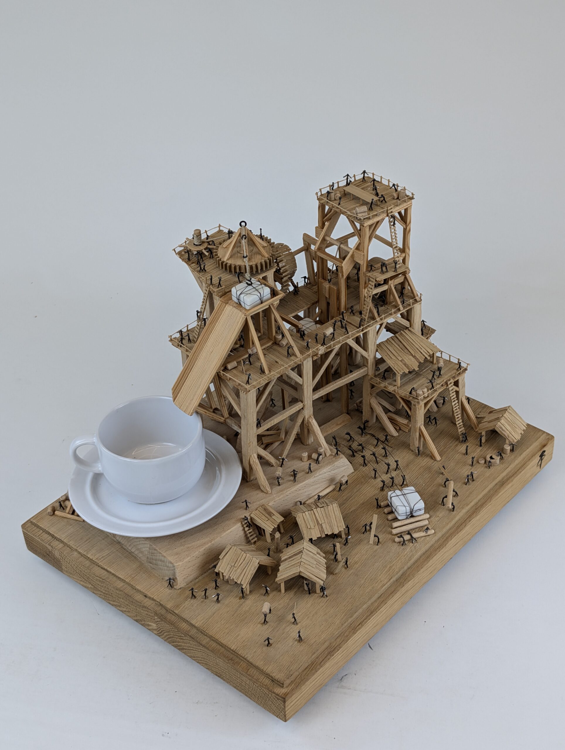 The models which I produce are made of wood, iron wire, sewing thread, and often everyday objects like spoons, sugar cubes, coffee mugs, etc. The very small scale of the miniature people crowding upon the model, is to impose a gods eye view on the spectator. This displays the work in crowd as the primary subject. In this vision we define ourselves as human in our combined efforts, dreams, and accomplishments. What does bind this characters is that they are all working together towards a common goal. This off course, turns the subject towards concepts like community and the engagements of cultures, and nations in history.