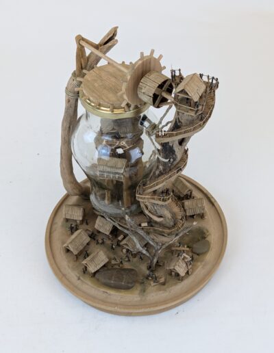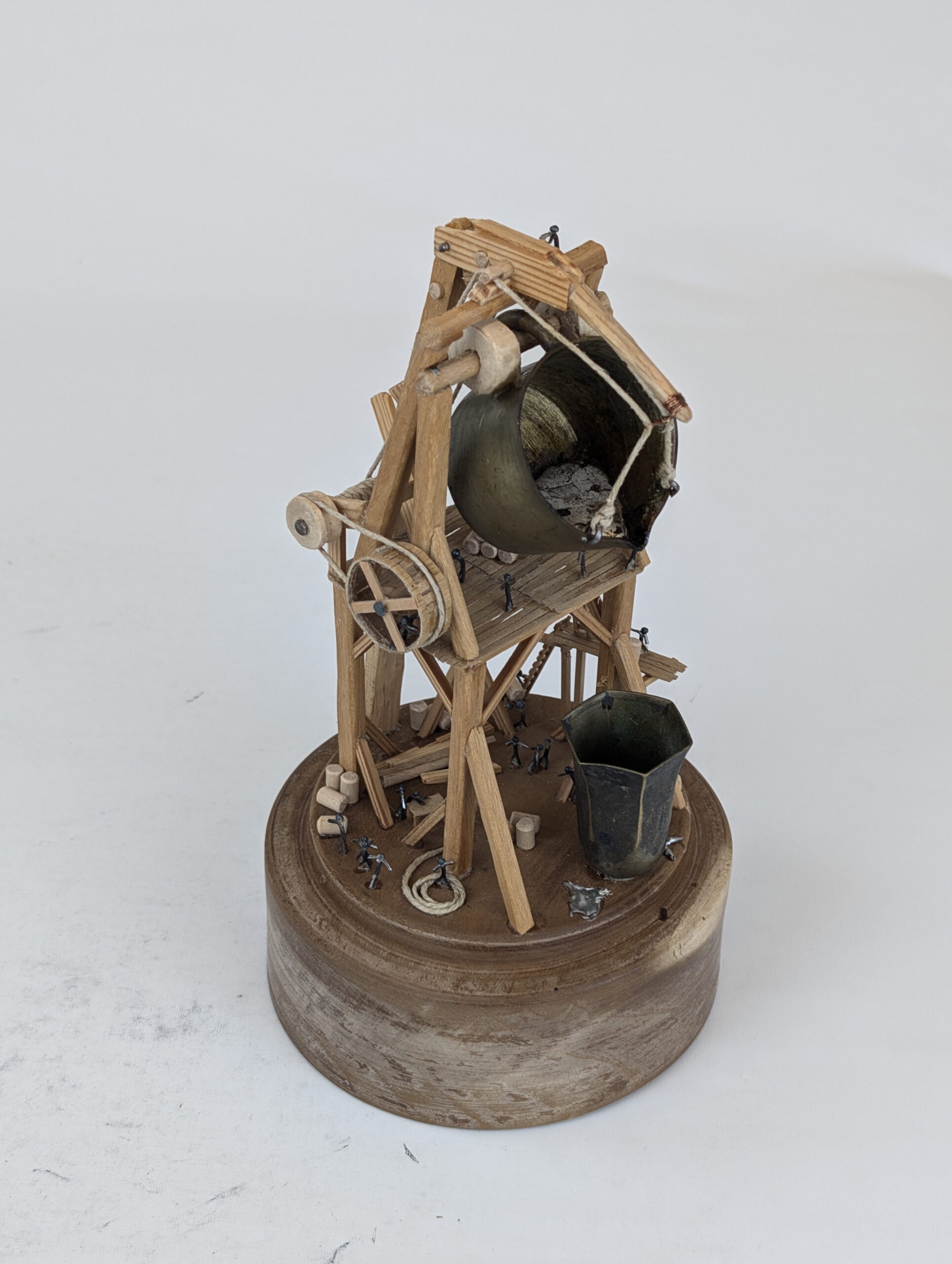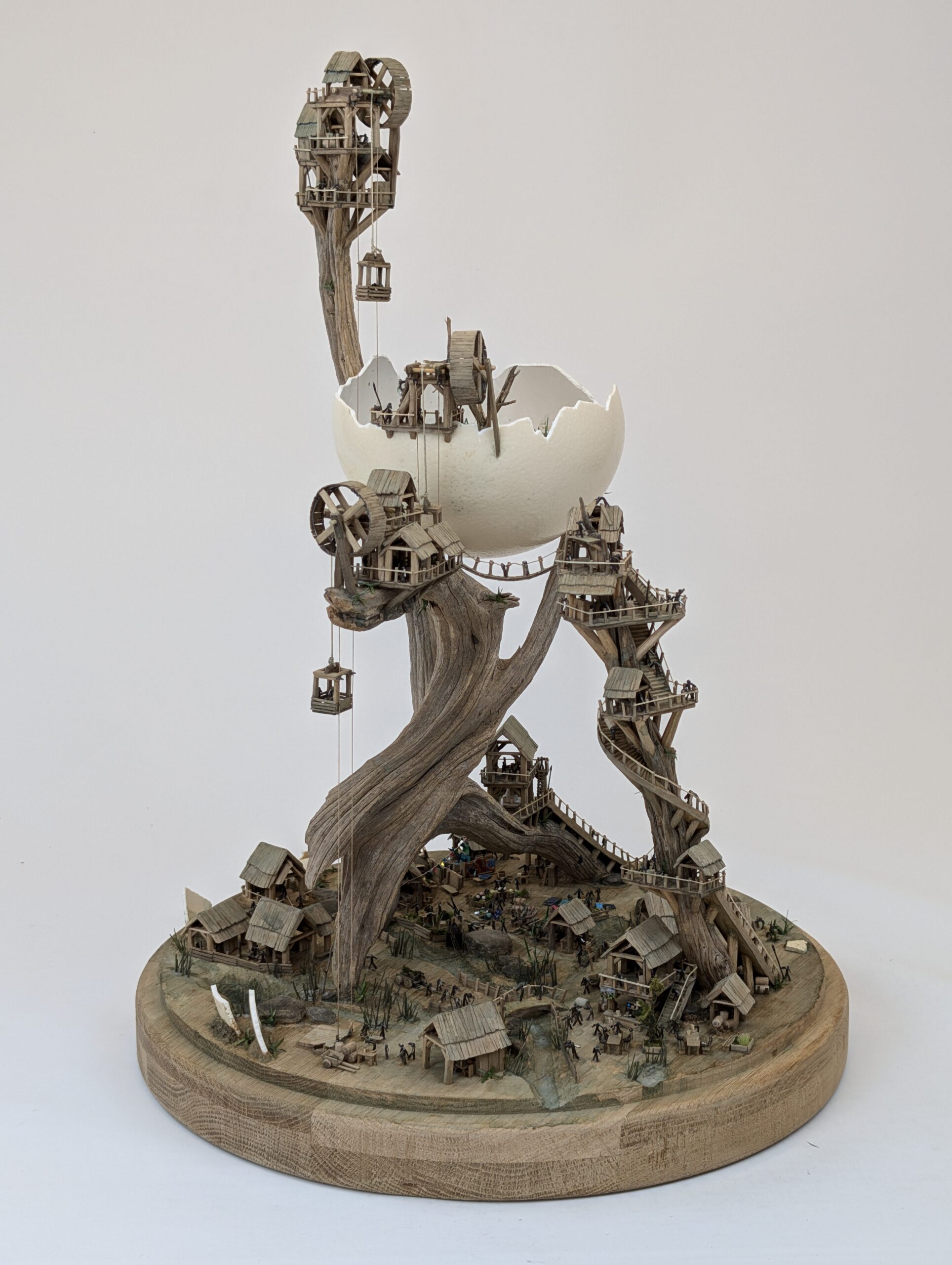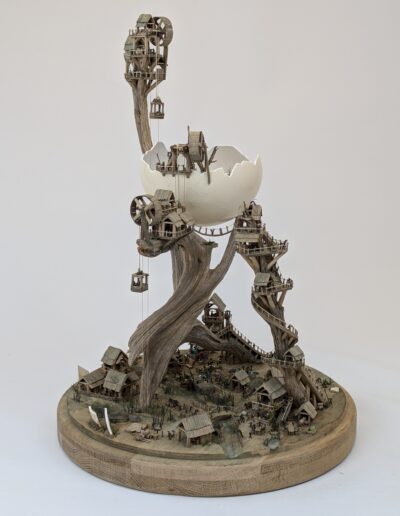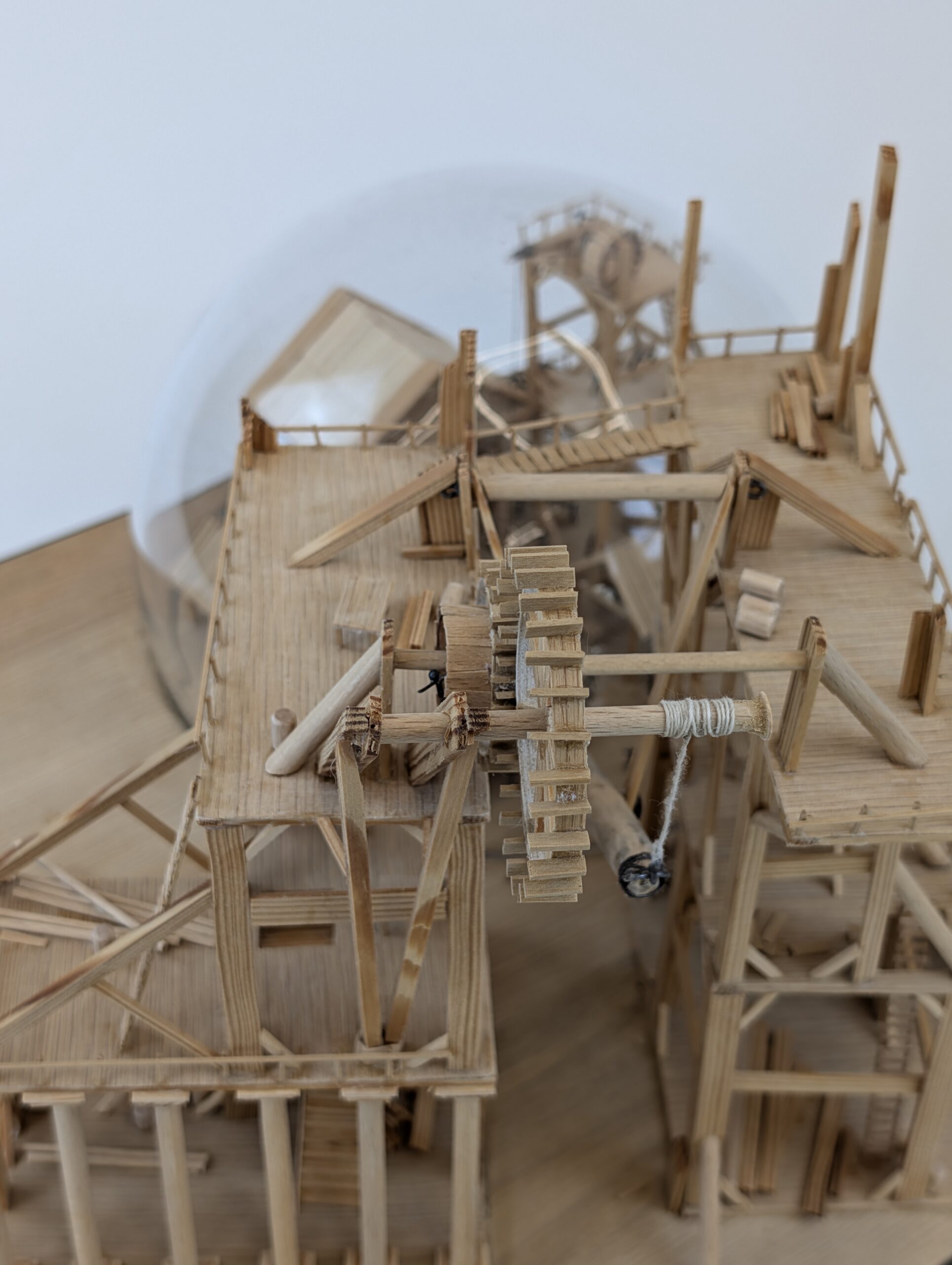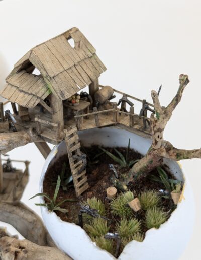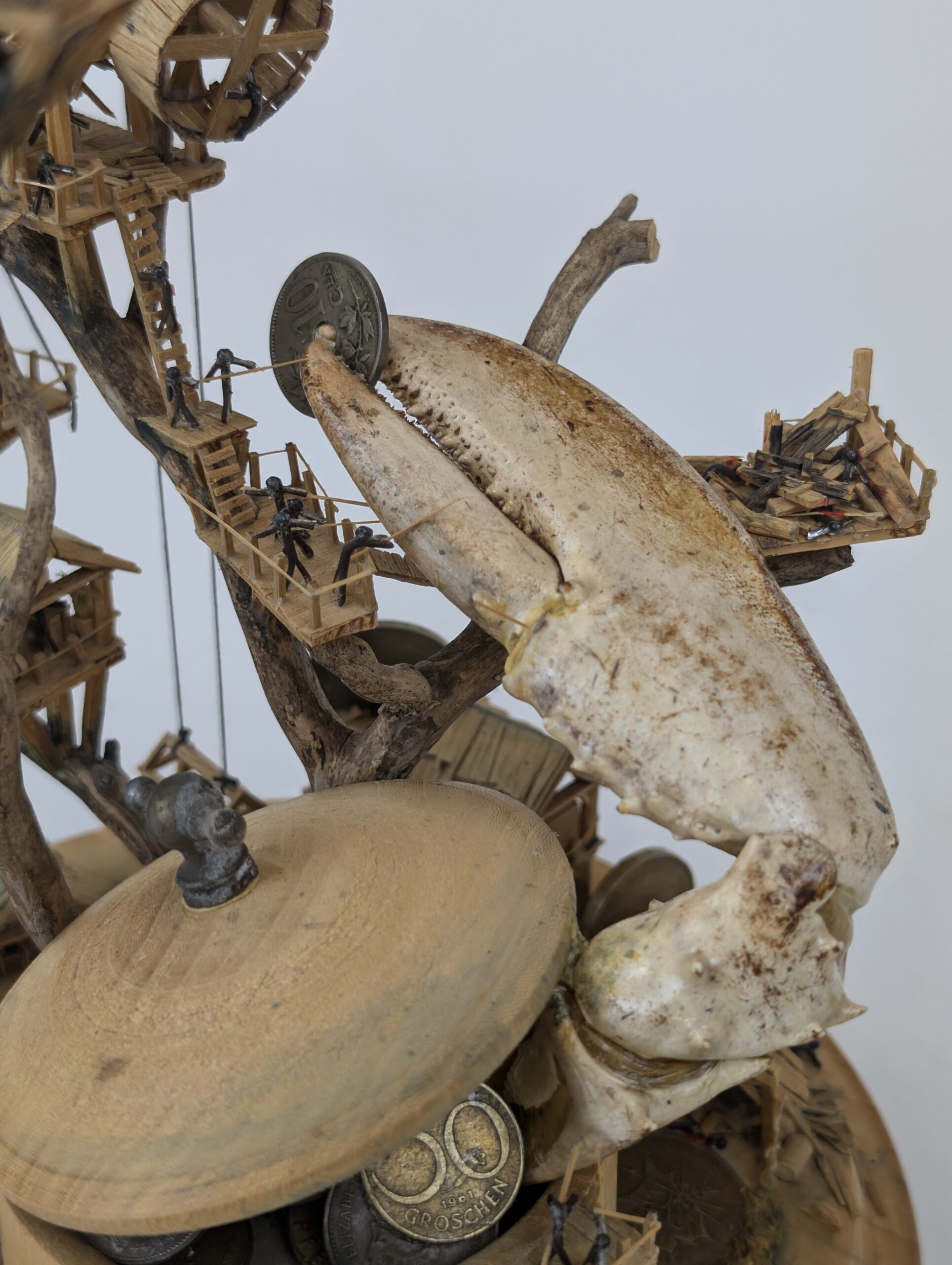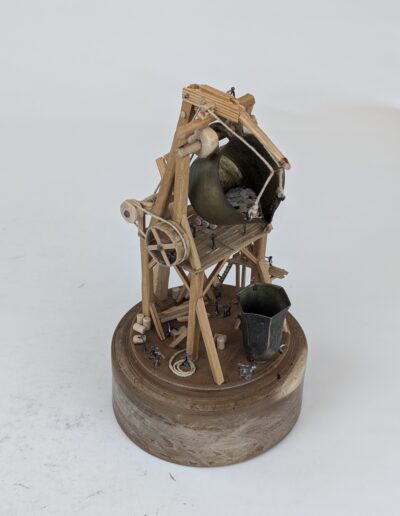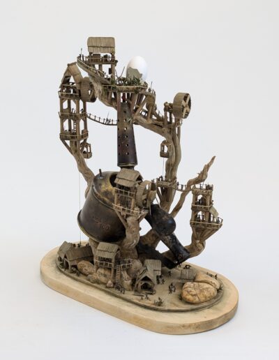 The models which I produce are made of wood, iron wire, sewing thread, and often everyday objects like spoons, sugar cubes, coffee mugs, etc. The very small scale of the miniature people crowding upon the model, is to impose a gods eye view on the spectator. This displays the work in crowd as the primary subject. In this vision we define ourselves as human in our combined efforts, dreams, and accomplishments. What does bind this characters is that they are all working together towards a common goal. This off course, turns the subject towards concepts like community and the engagements of cultures, and nations in history.