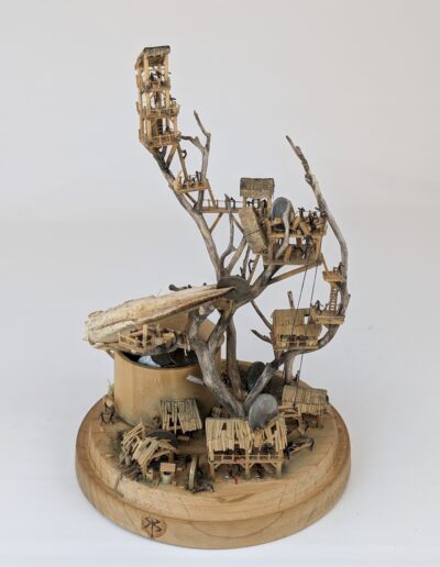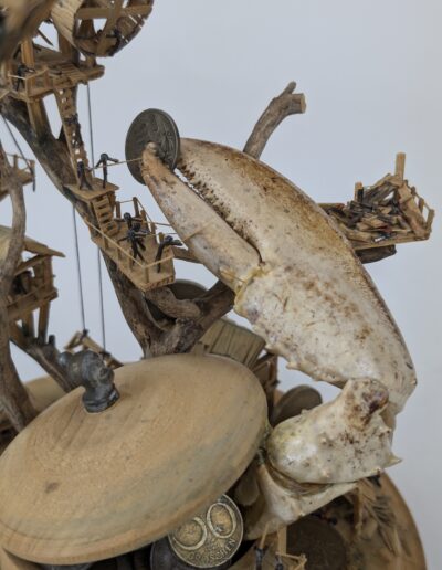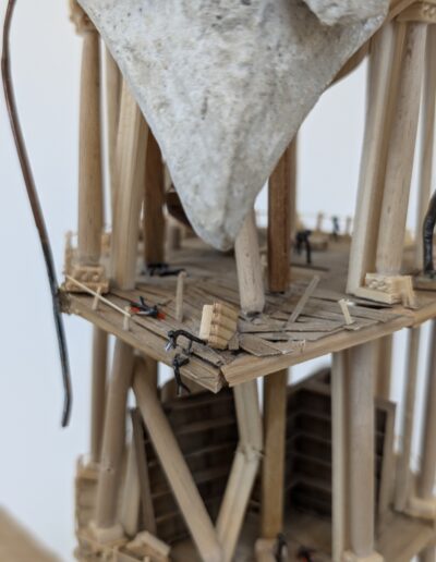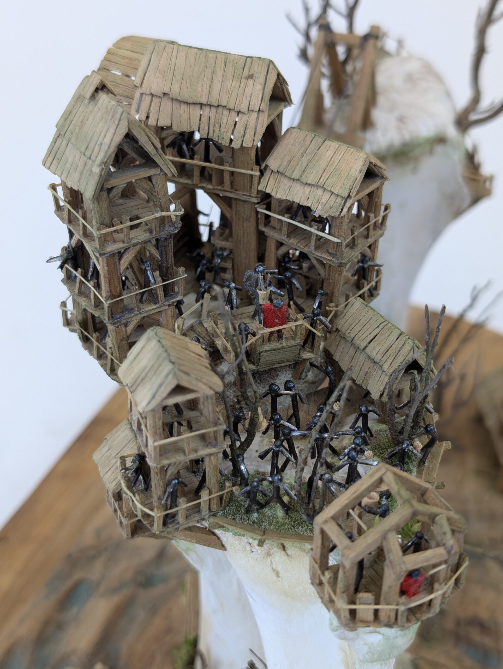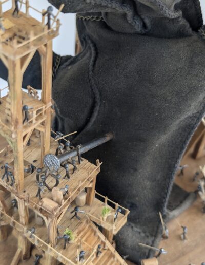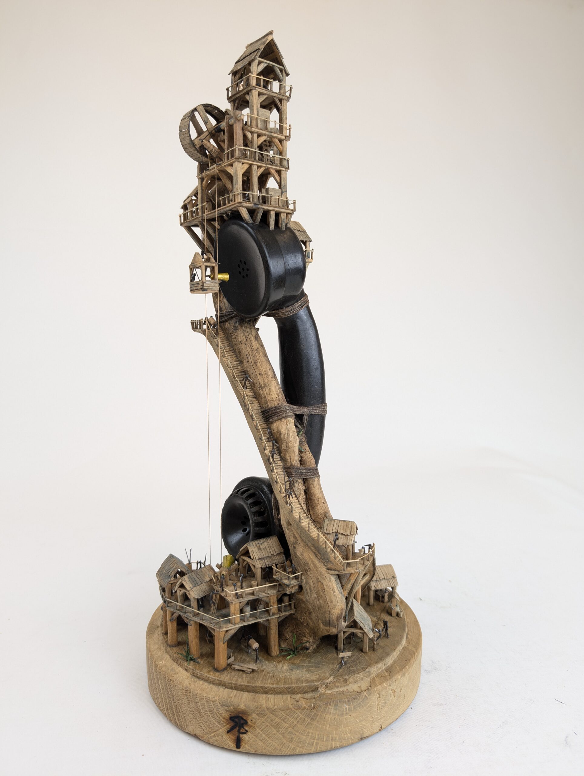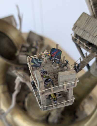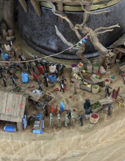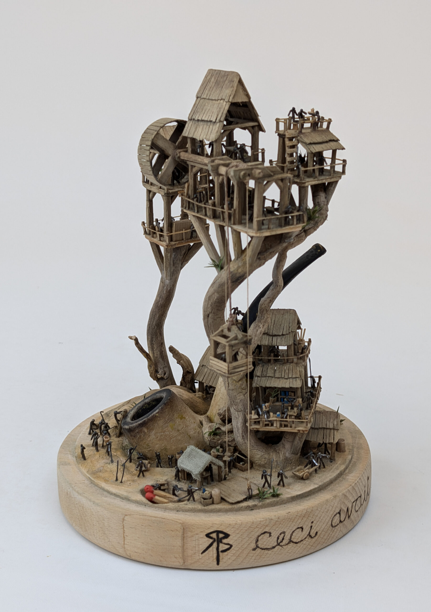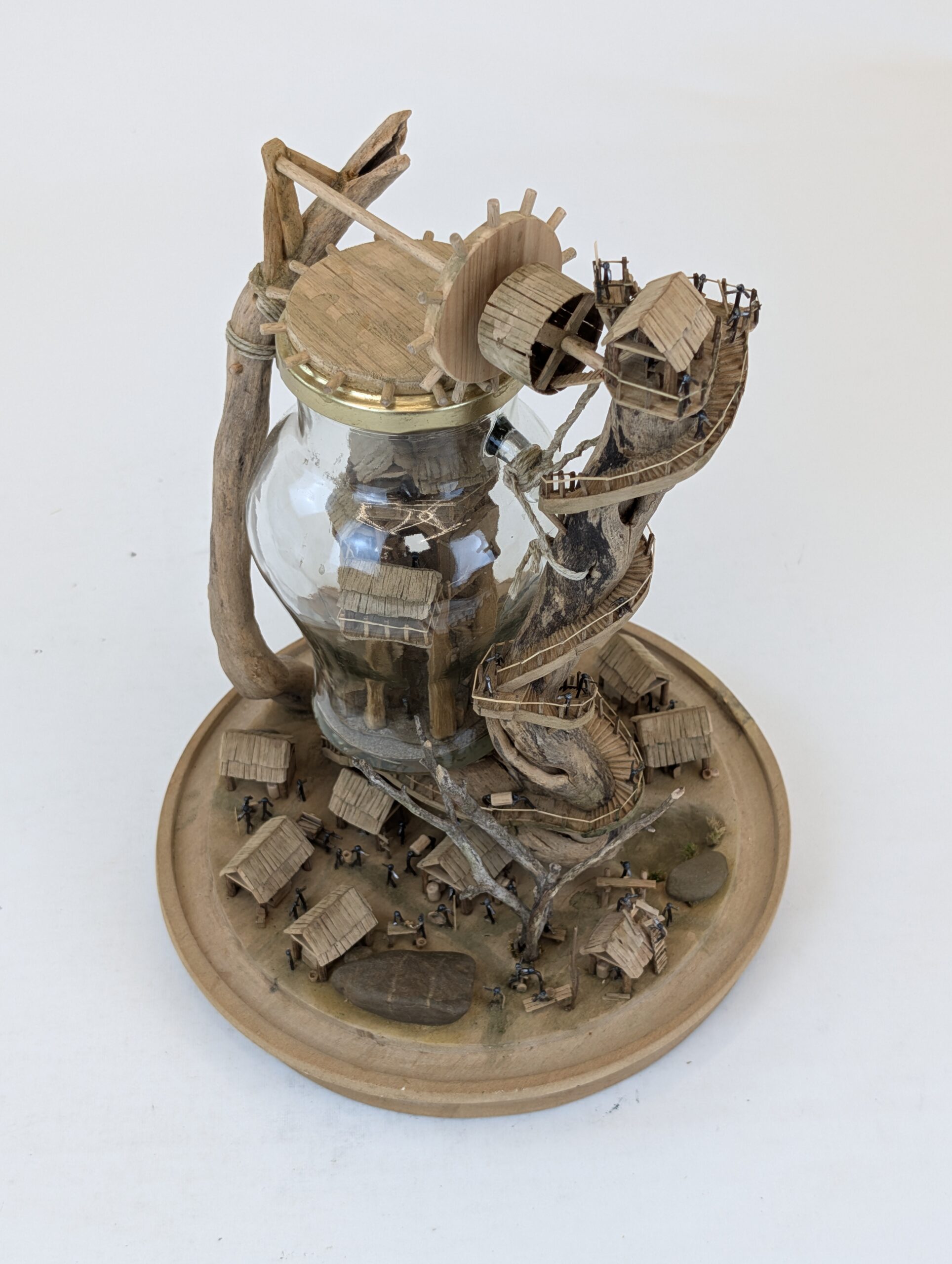 The models which I produce are made of wood, iron wire, sewing thread, and often everyday objects like spoons, sugar cubes, coffee mugs, etc. The very small scale of the miniature people crowding upon the model, is to impose a gods eye view on the spectator. This displays the work in crowd as the primary subject. In this vision we define ourselves as human in our combined efforts, dreams, and accomplishments. What does bind this characters is that they are all working together towards a common goal. This off course, turns the subject towards concepts like community and the engagements of cultures, and nations in history.