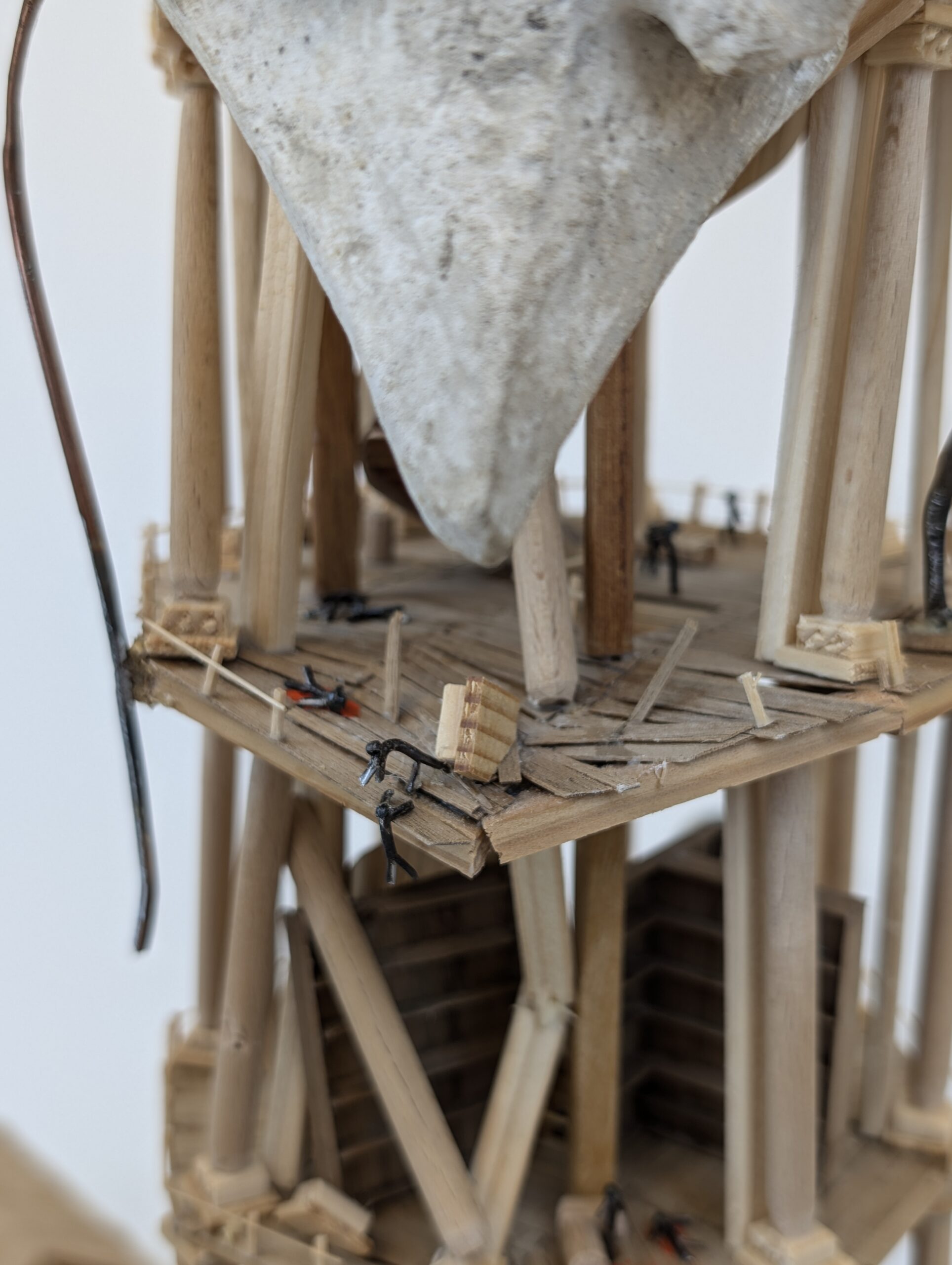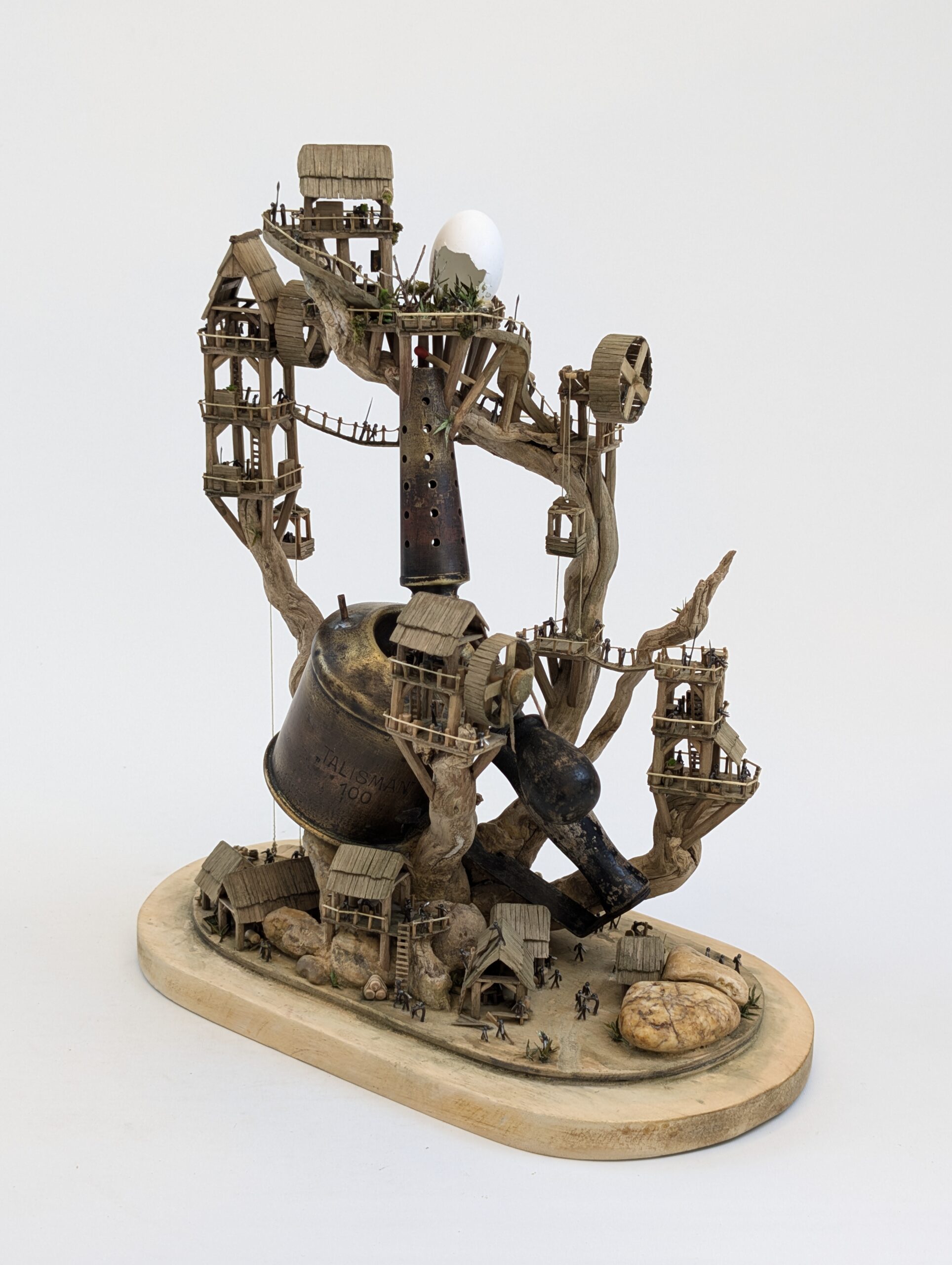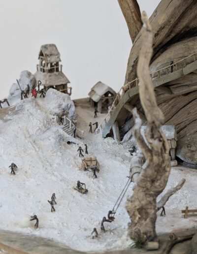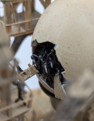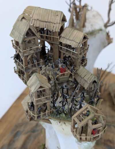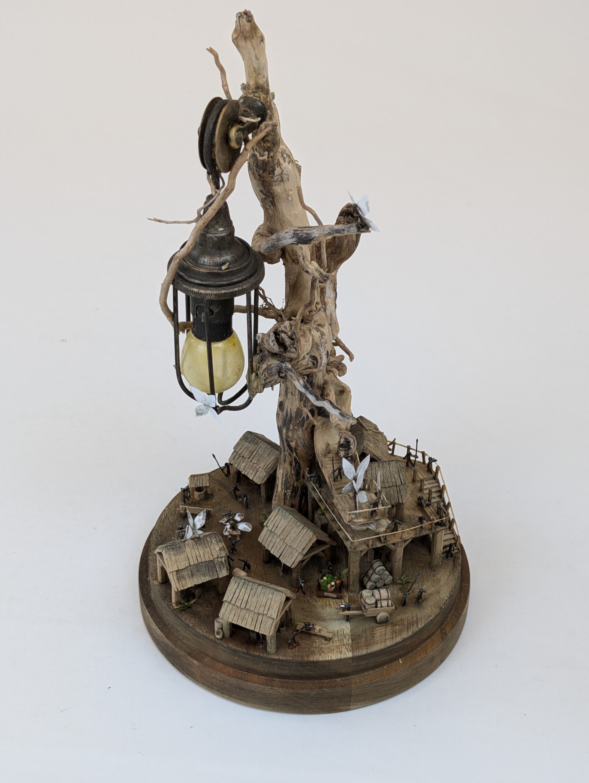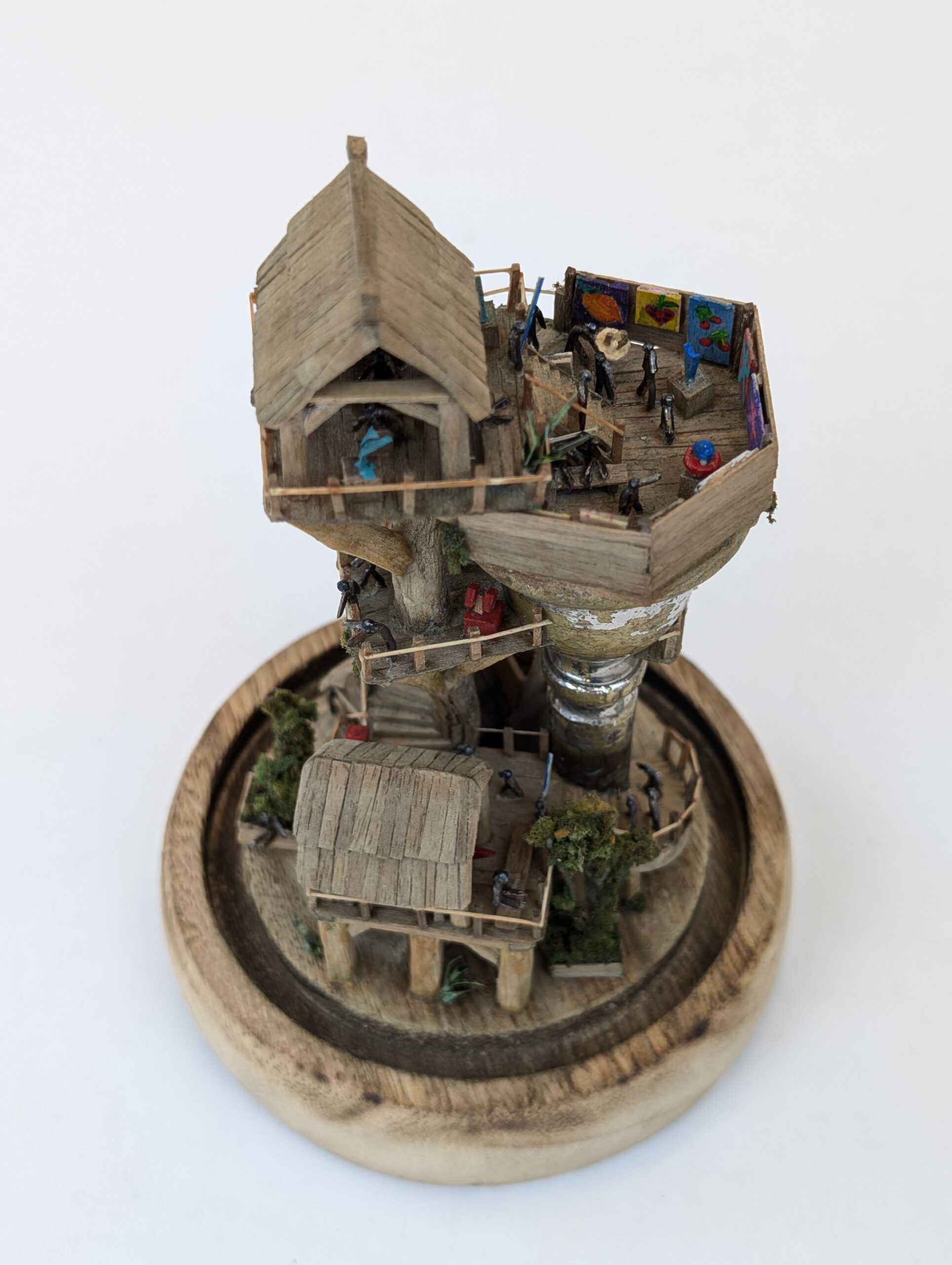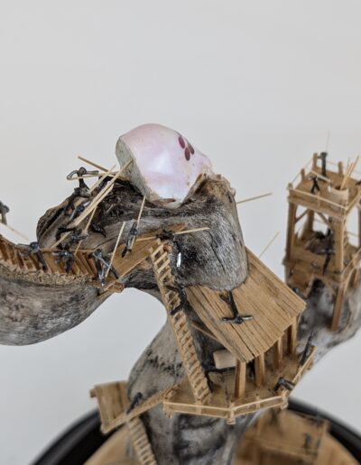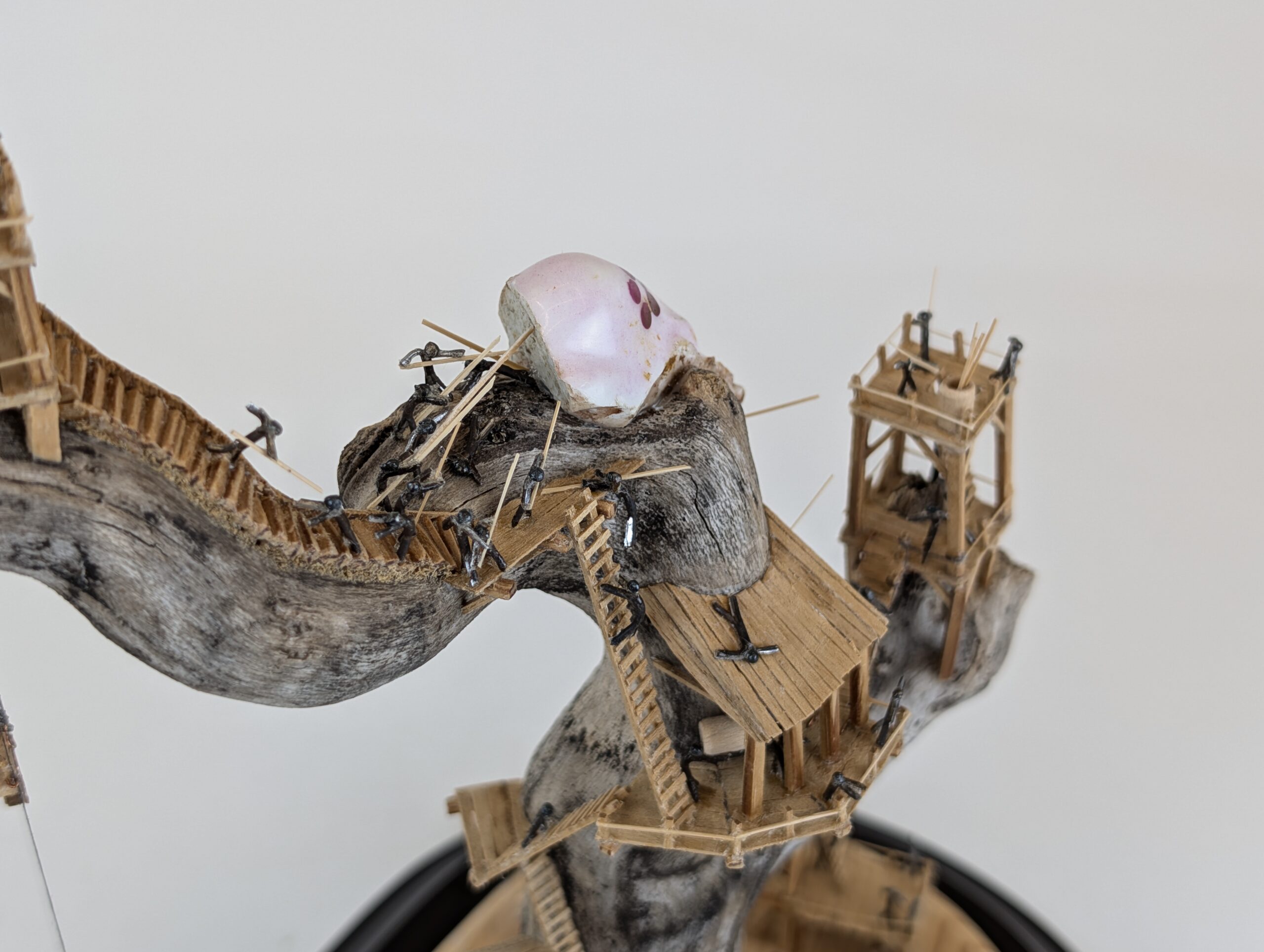 The models which I produce are made of wood, iron wire, sewing thread, and often everyday objects like spoons, sugar cubes, coffee mugs, etc. The very small scale of the miniature people crowding upon the model, is to impose a gods eye view on the spectator. This displays the work in crowd as the primary subject. In this vision we define ourselves as human in our combined efforts, dreams, and accomplishments. What does bind this characters is that they are all working together towards a common goal. This off course, turns the subject towards concepts like community and the engagements of cultures, and nations in history.